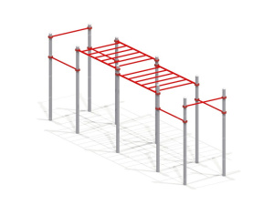 Комплекс представляет собой конструкцию из 10-ти несущих стоек, установленных в два ряда параллельно друг другу. В каждом ряду и проеме несущие стойки соединены 6-тью разноуровневыми перекладинами и двумя разноуровневыми рукоходами. Оборудование крепится к стойкам комплекса через хомуты диаметром 140 мм. Несущие стойки выполнены из металлической трубы диаметром 88 мм. Перекладины, крепящиеся к стойкам при помощи хомутов изготовлены из металлической трубы диаметром 33 мм. Рукоход состоит из 2-х направляющих металлических труб диаметром 42 мм и перекладин из трубы диаметром 33 мм.