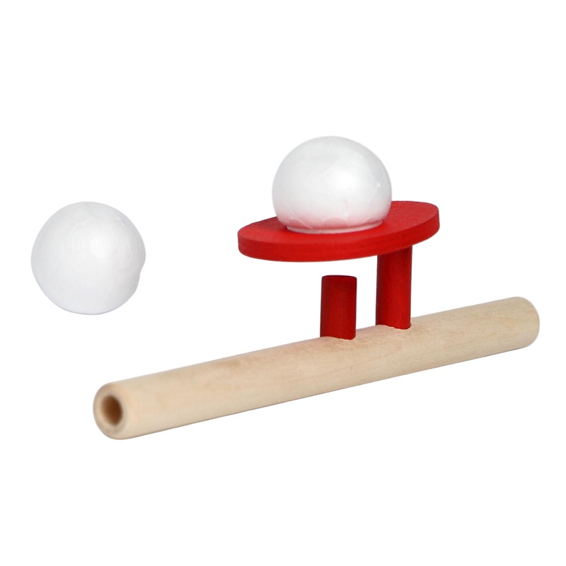 Тренажёр для дыхания выполнен из дерева. Играть с ним легко и просто: нужно положить пенопластовый шарик в отверстие, а затем дунуть со всей силы, чтобы шар подскочил в воздух.