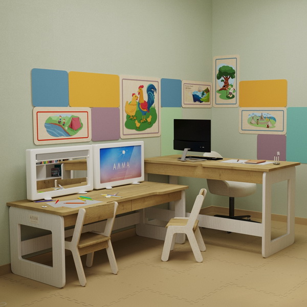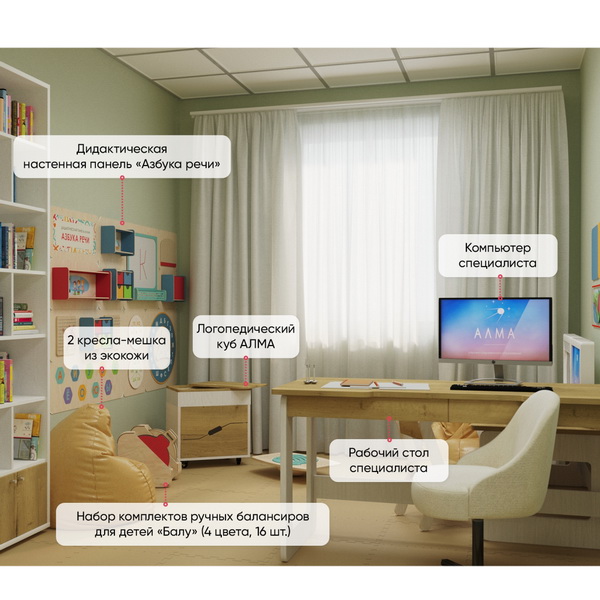 Готовое решение по оснащению кабинета логопеда в ДОУ. Содержит всё необходимое современное оборудование для эффективной работы детского специалиста: стол логопеда с компьютером, рабочий стол для детей, интерактивную панель с профильным ПО для логопедов «Звукоречье», дидактическую панель «Азбука речи», набор корпусной и мягкой мебели, безопасные зеркала, нейротренажеры, методические материалы и пособия.