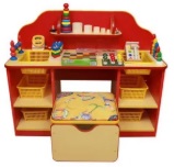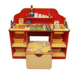 Стол с наполнением предназначен для различных развивающих занятий. Для хранения дидактических пособий предусмотрены открытые тумбы с полочками и корзинками и открывающийся пуфик.