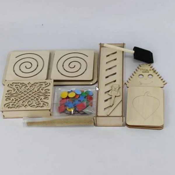 - Набор развивающих линеек - линейки в комплекте, имеется деревянный карандаш. С его помощью на песке появятся настоящие узоры, разовьется моторике и рука подготовится к письму. Материал - дерево.