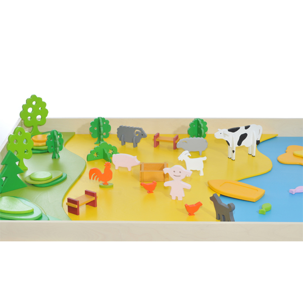Материал: стол - ЛДСП 16 мм, фигурки и элементы ландшафта - фанера.