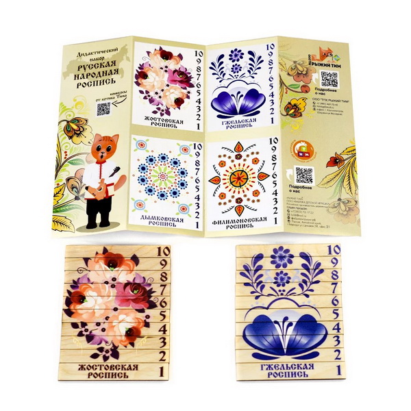 Дидактический набор состоит из 12 плашек с изображением русской народной росписи. Каждая плашка разделена на 10 частей. В состав набора входит наглядный материал для сборки плашки.