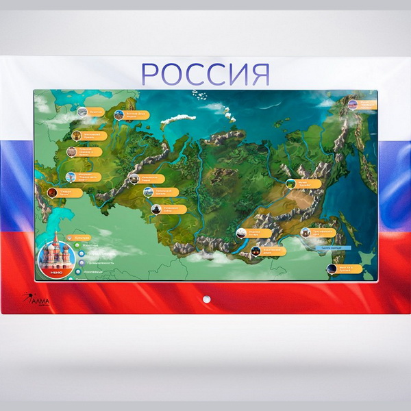 - Интерактивная настенная панель, оформленная в стилистике российского триколора. (43 дюйма, Full HD, мультитач 10 касаний, характеристики встроенного компьютера уточняйте у менеджера)