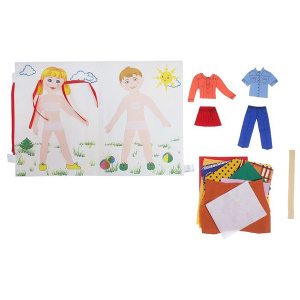 На нем нашиты силуэты мальчика и девочки. В набор входит комплект одежды для каждого из детей и комплект материалов для самостоятельного конструирования и изготовления одежды.