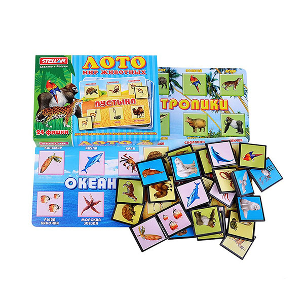 Фишки складываются в мешочек, игрокам раздаются карточки. Ведущий достаёт фишки из мешка, а игроки накрывают ими совпавшие картинки.