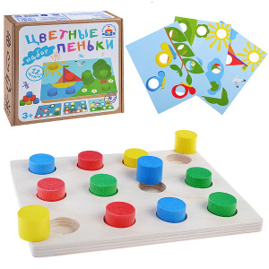 Игра с цветными пеньками и выкладывание их в правильном порядке в соответствии с заданиями на карточках обязательно понравится малышу.