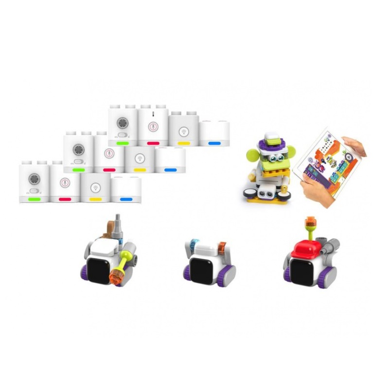 Комплект предназначен для занятий робототехникой группы из 3-6 детей возрастом от 3х лет. В составе 3 безэкранно программируемых робота с дополнительными модулями расширящими функционал роботов. Каждый набор робота содержит: схемы сборки одной изшести конфигураций мобильного робота, командные карты с кодами, 2 картами-поля с 4 темами. Программируется движение и реакции роботапри помощи командных карточек, входящих в комплект.