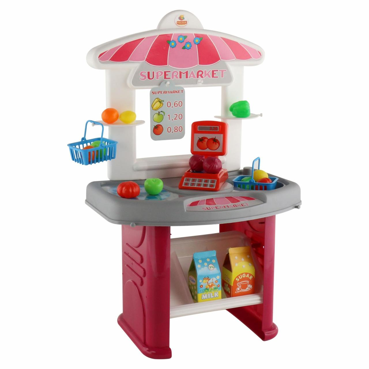 Набор-мини Супермаркет представляет собой маленький прилавок и витрину, где продаются фрукты и овощи: