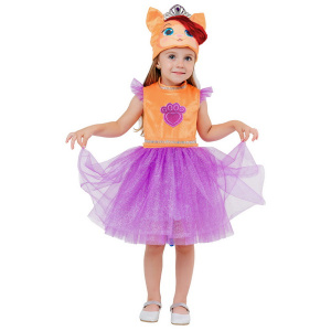 Яркий оранжево-розовый наряд идеален для тематических праздников, утренников и фотосессий. Устройте костюмированное чаепитие для девочек по мотивам мультика "Королевские питомцы". Костюм сшит по лицензии с компанией Дисней. В комплекте платье и шапка-маска.