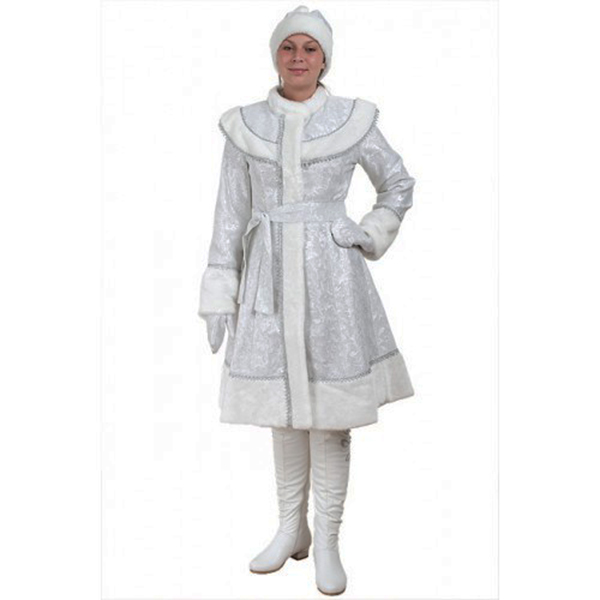 Модернизированная "классика" белого цвета. Модель относится к эконом классу. Внешний вид и детализация костюма на высоком уровне. Данная модель исполнена из ткани сантун белого цвета. Костюм выглядит празднично и красиво. Идеально подойдет для домашнего праздника или на корпоративной вечеринке. Добавлена новая деталь костюма - вшитая пелерина. На рукавах и подоле более широкая полоска меха.