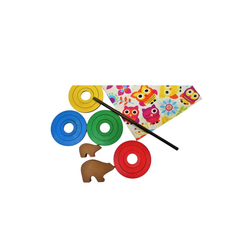 - активизация экспрессивной речи; введение в импрессивную речь предлогов обозначающих пространство (предлоги в, на. В зеленое "колечко-домик" посадим мишку.)